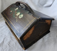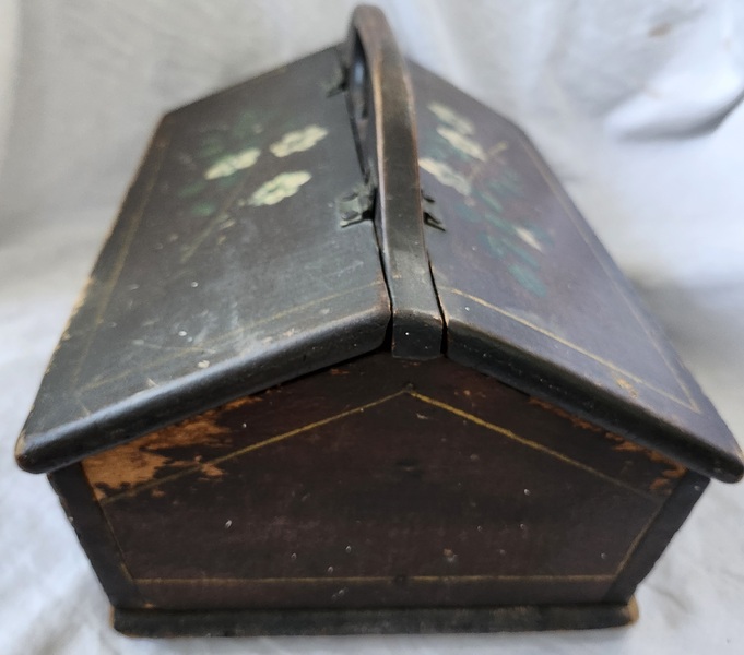 For sale is a wonderful antique primitive miniature tole painted and japanned dome top box that I acquired in the Midwest. It has a floral design on the front. a latch, as well as a wire loop handle, and measures about 3" long, 2" wide, and 2" tall, and is in antique condition, with a dark patina and age related wear, but no major dents, etc. Please look carefully at the pictures, and contact me with any questions or for additional photos.