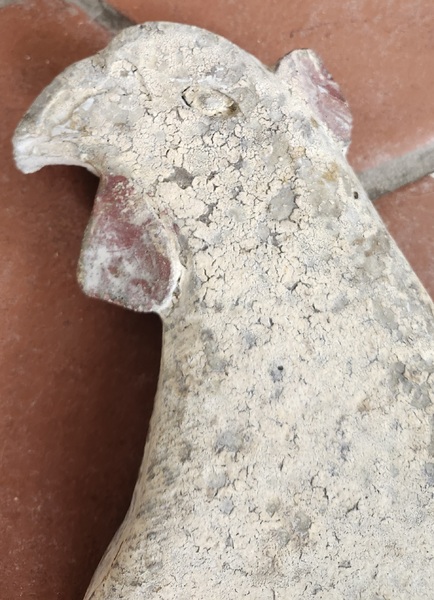 For sale is a very sweet vintage Pennsylvania folk art chicken whimsy/pin cushion that has been in my collection for quite a few years. It is hand sewn, has naively embroidered eyes, a red wool comb, and a wattle that appears to be made from some kind of red trim. The rickrack wings are glued in place, and the piece is filled with cotton, or possibly even thread remnants, as it feels slightly bumpy. The piece measures about 2 3/4" tall, 2 7/8" long, and 1 1/8" in diameter on the bottom, and is in nice vintage condition, with no significant flaws. Please look carefully at the pictures, and contact me with any questions or for additional photos.