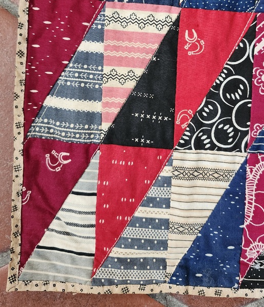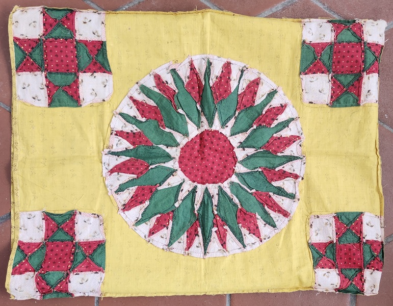 For sale is a wonderful antique Pennsylvania patchwork sort of "trip around the world" pattern pillowcase that I acquired in that area. It hand pieced and hand bound of terrific old calico fabrics, as well as a green and brown floral print backing. The piece measures about 20" square, and is in very nice condition, with the only very minor issue being a bit of toning around the edges. Please look carefully at the pictures, and contact me with any questions or for additional photos.