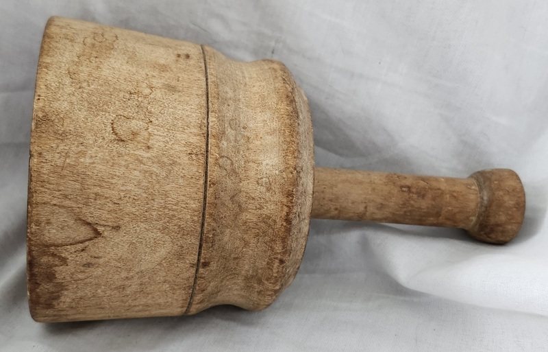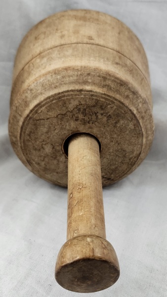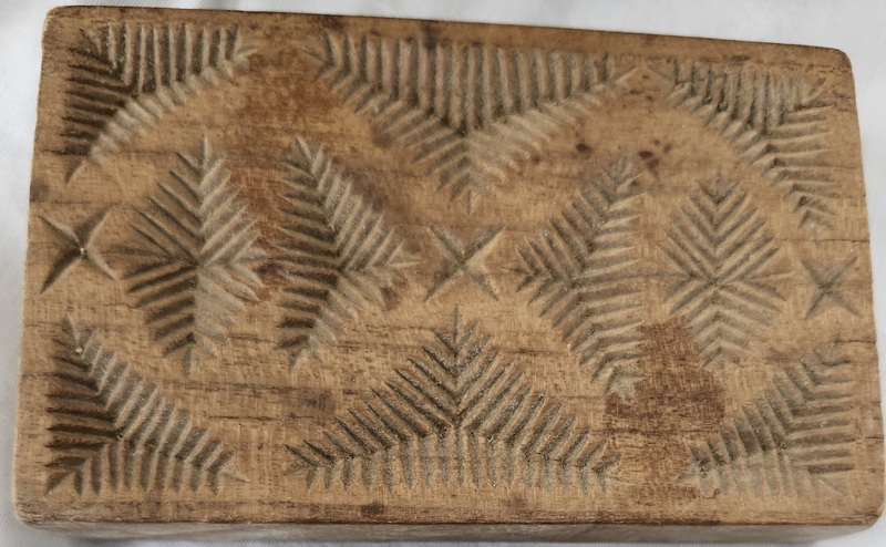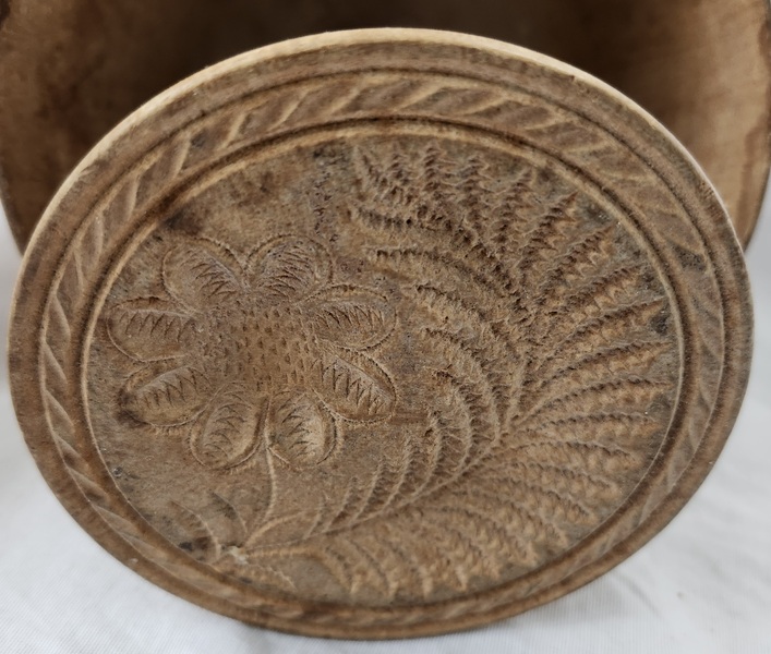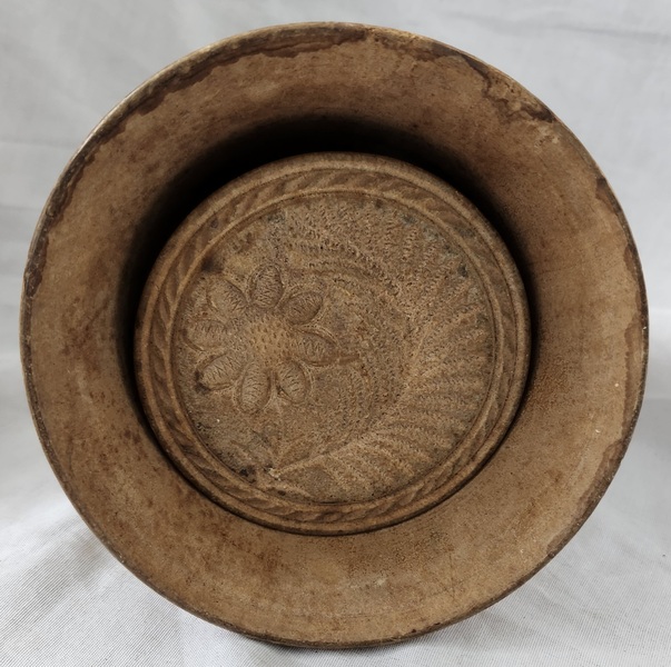 For sale is an antique folk art butter mold that has a fairly deeply carved image of a flower, possibly a sunflower or daisy, and a fern leaf that I acquired in Atlanta. It formerly belonged to a Pennsylvania collector, and may have been made there, but I'm unsure. The piece measures about 8" long to the end of the handle, and 4 3/4" in diameter, and is in very nice antique condition, with an aged patina, but no significant issues. Please look carefully at the pictures, and contact me with any questions or for additional photos.