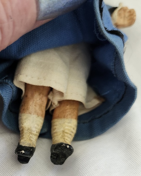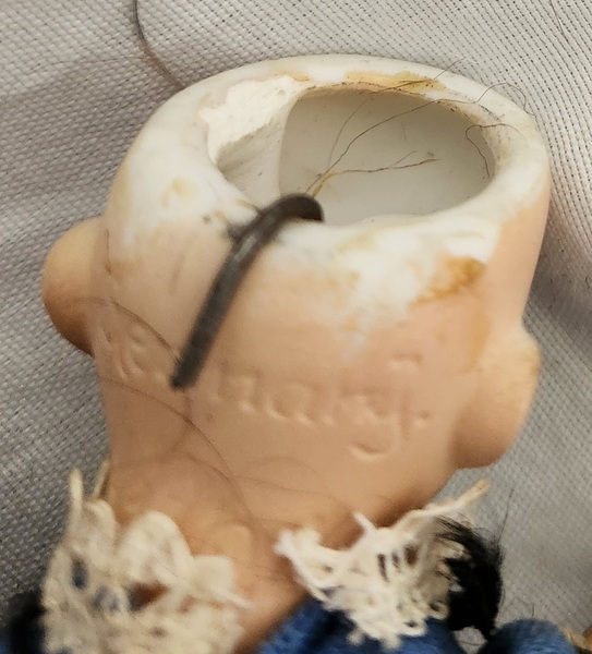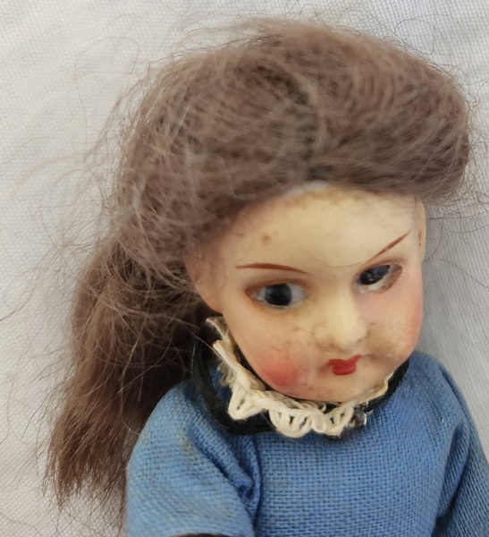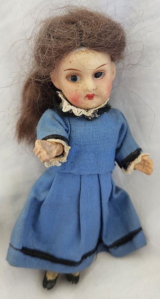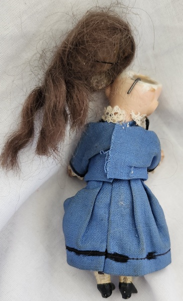 For sale is a a small antique bisque and composition jointed doll that I acquired from New York state. On the back, she is marked "Germany, 16/0.M., and I'm sure that you doll experts know what that means, but I really don't know. She has blue glass eyes, hand painted facial features, socks, and shoes, and her original wig that I believe is mohair. She is wearing her original clothes, and measures about 5" tall. The doll is in nice antique condition, although the wig has detached from the head. Please look carefully at the pictures, and contact me with any questions or for additional photos.