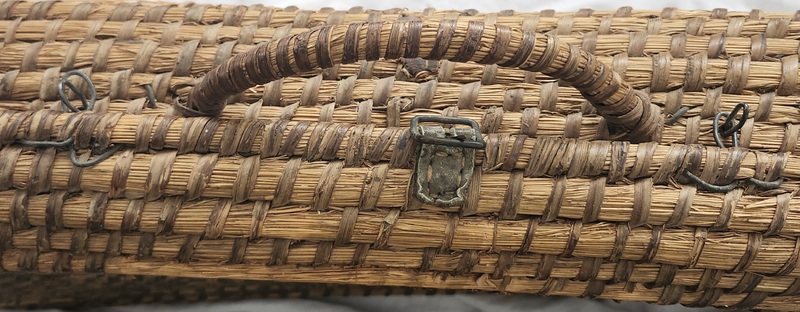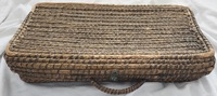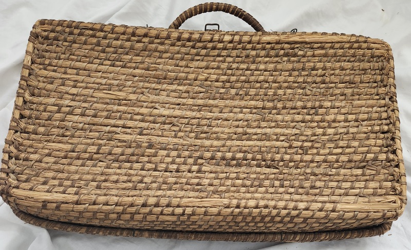 For sale is what I believe a quite rare antique Pennsylvania primitive folk art rye grass suitcase similar to the baskets that you find that were made there. I've certainly never seen anything remotely similar to it. I acquired it from a dealer friend in Maryland, and it has wire hinges and 2 wire closures on the front. There are also remnants of a leather strap & metal buckle in the middle between the wire closures. The piece measures about 24" long, 14" wide, and 5 1/2" tall, and is in nice antique condition, with a warm aged patina, as well as the previously mentioned issues with the leather strap. Please look carefully at the pictures, and contact me with any questions or for additional photos.