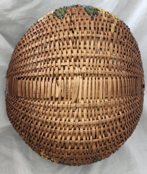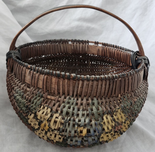 For sale is a charming antique late 19th to early 20th century folk art buttocks basket with a painted flowers design on both sides that I have had for several years. There is also black paint around the rim, on the handle, and one the gods' eyes. The basket measures about 8 3/4" long and 7 1/2" wide on the top, and 7 1/2" tall including the handle. On the bottom, the measurements are about 11" x 9". It is in nice, but antique condition, with a few areas of missing splints around the rim, but no other significant flaws. Please look carefully at the pictures, and contact me with any questions or for additional photos.
