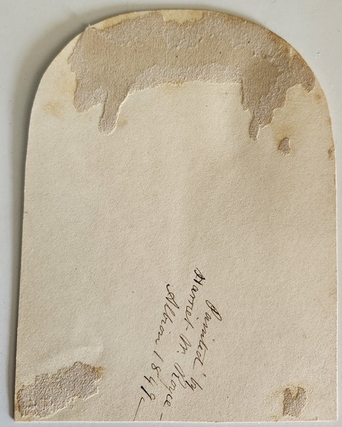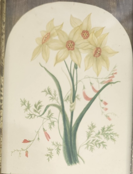 For sale is a charming antique framed watercolor of daffodils and other delicate red flowers that I acquired in Nashville from a Pennsylvania dealer. When it was removed for examination, I found writing that said "Painted by Harriet M. Royce, Albion, 1849". There is an Albion, PA, and also an Albion, Maine, so it could have been painted in either of those places. It is mounted on acid free backing that has been painted brown on the front, and housed in a wonderful old painted frame with its original metal hanger. The framed painting measures about 9" x 7" with sight measurements of 6" x 4", The image itself is about 4 1/2" x 3". The watercolor is in nice antique condition, with very light toning, and a tiny barely detectable spot or 2, and the frame has minor age related wear, but displays very well. Please look carefully at the pictures, and contact me with any questions or for additional photos.