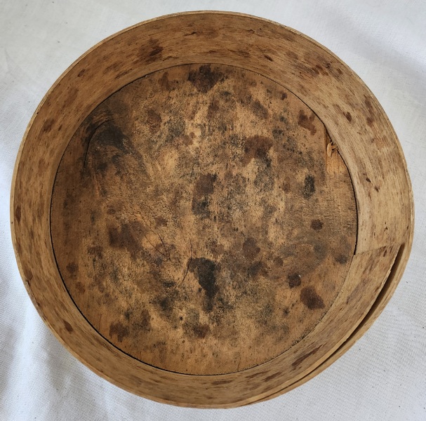 For sale is one of 2 antique primitive painted pantry boxes that I believe were made, or at least painted by the same person. They are both painted a dark reddish brown with mustard dots/strokes, and the lid on this one is embossed "Orlando,?????, Mass." Both measure about 6 1/2" in diameter and 2 3/4" tall, and are in nice antique condition, with signs of age and use, but no significant issues. Please look carefully at the pictures, and contact me with any questions, or for additional photos.