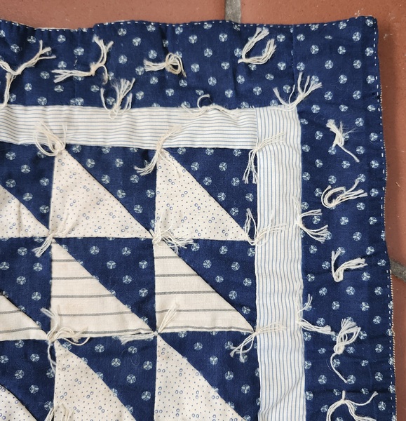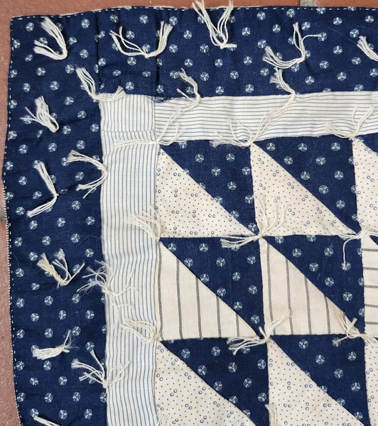 For sale is a sweet antique doll quilt, or technically comfort quilt, as it is tied rather that quilted. I acquired it in Nashville, and it is completely hand pieced ana hand bound. It is filled with cotton batting, and measures about 17 1/4" x 14 1/2". It is in nice antique condition, with a couple of small light brown areas on the front, and toning and a few light stains on the back. Please look carefully at the pictures, and contact me with any questions or for additional photos.