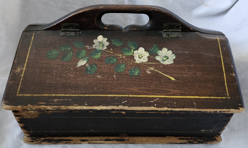 For sale is a wonderful antique folk art lidded knife box with a painted floral design on both lids that I acquired in Nebraska. There is also painted piping, and a faux painted background. It is constructed with square nails and measures about 12" long, 8 1/2" wide, and 7" tall including the handle. It is in nice antique condition with signs of age and use, especially on one side, but it displays very nicely. Please look carefully at the pictures, and contact me with any questions or for additional photos.