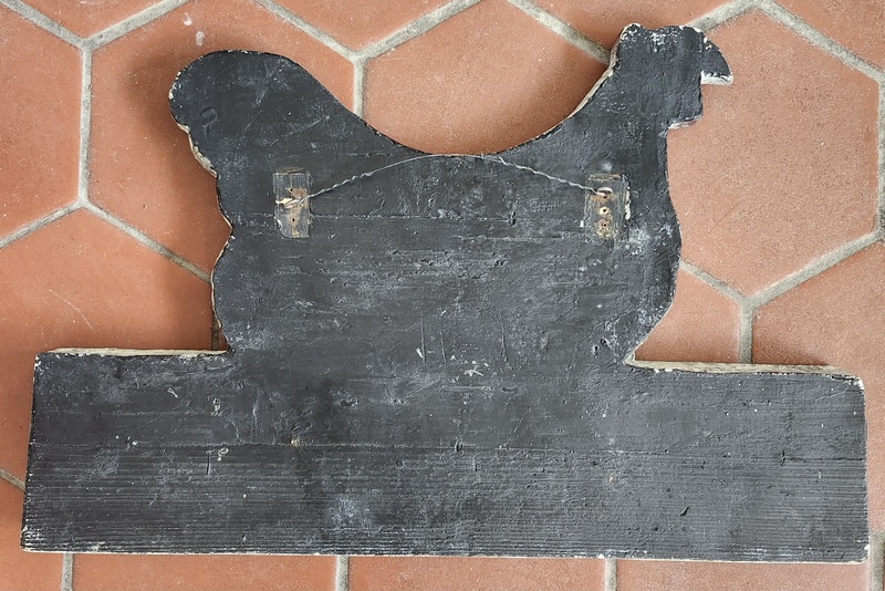 For sale is a terrific old and authentic trade sign in the form of a chicken/hen t6hat says "Broilers" , "Fresh Eggs" that I acquired in Nebraska. It appears to be made of both metal and wood, and is quite heavy for its size. there is a hanger on the back that is definitely a replacement, as there are several holes where previous hangers originally were. The piece measures about 23 3/4" long, 15 3/4", and 1 3/4" front to back, and is in vintage but displayable condition, with many signs of having been exposed to the elements. Please look carefully at the pictures, and contact me with any questions or for additional photos.