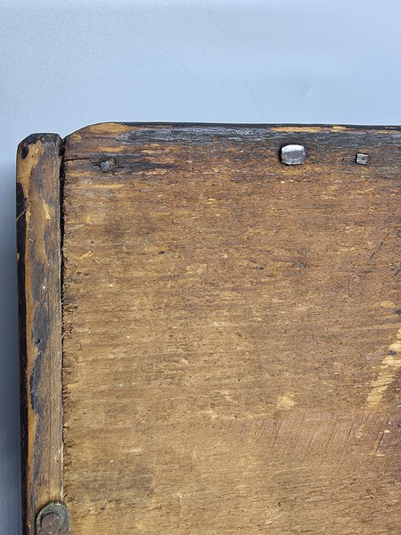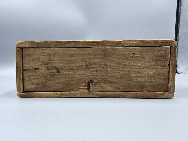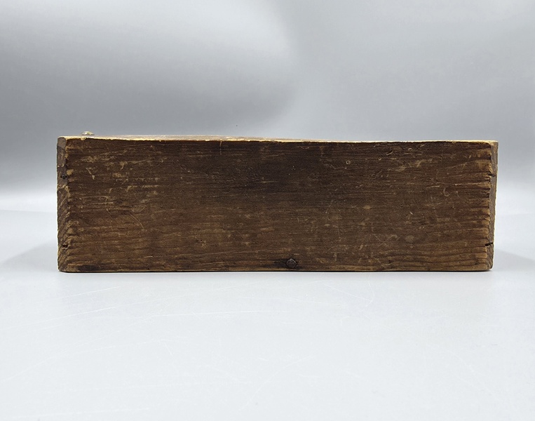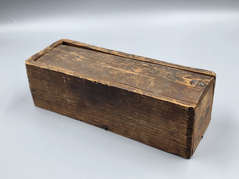 An early slide lid box in old unfinished surface. Made of pine with early square nails. Has great surface on the wood from historic use and a brass tack. Excellent condition edition with a slightly loose but stable bottom. 10"L. New England origin.