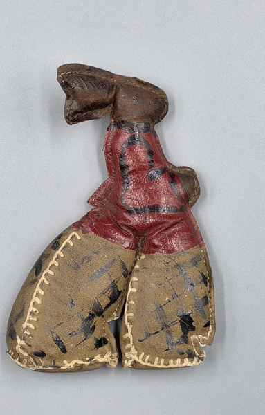 A 20th c. little stuffed toy rabbit made of leather. Really neat with old paint and looks like a cowboy! 3 1/2"T.