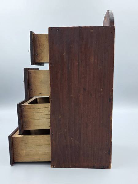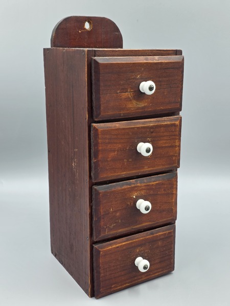This little set of spice drawers is really nice....made of pine with a shaped top and porcelain knobs which are original. Has a fabulous varnish finish on pine wood with iron nails. The best size as well at 11 3/4"T. New England origin.