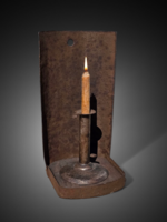 A really fantastic early lighting shelf made of tin with a walnut wood base. The base is attached via small iron nails. Retains a fantastic surface all around woth patina, surfsce oxidation and coloring. Superb condition! 12"T ****candlestick NOT included***.