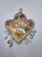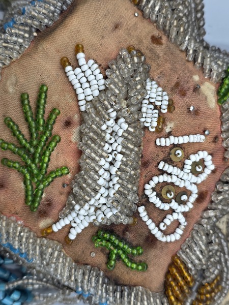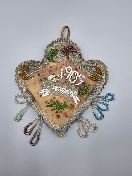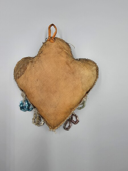 1920s Native American pin cushion with hassle decoration and a large running rabbit. Good condition with some minor fading. 8"W.