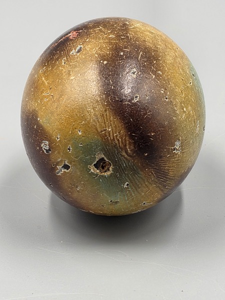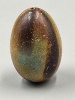 This daring egg is made of pine and has multiple colors of paint...blue, brown and mustard. Lathe turned and is in excellent condition for its age and use. Ca. 1900. 3"T.