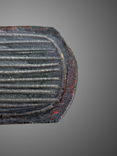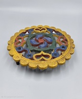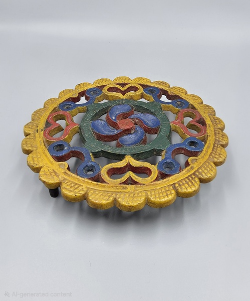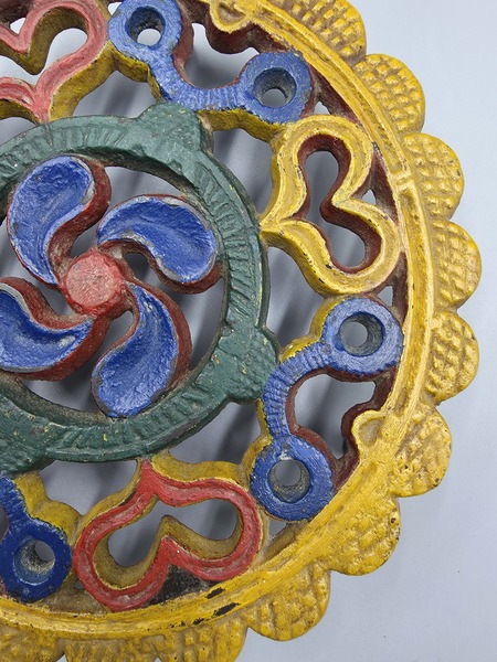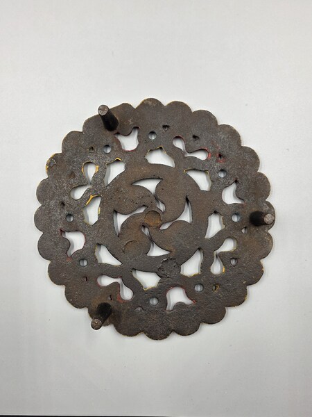This iron trivet is fabulous. Cast molded with shaped elements including hearts and a giant flyfot and scalloped edge. Has great original paint. Excellent condition. Ca. 1900. 7 1/4"W