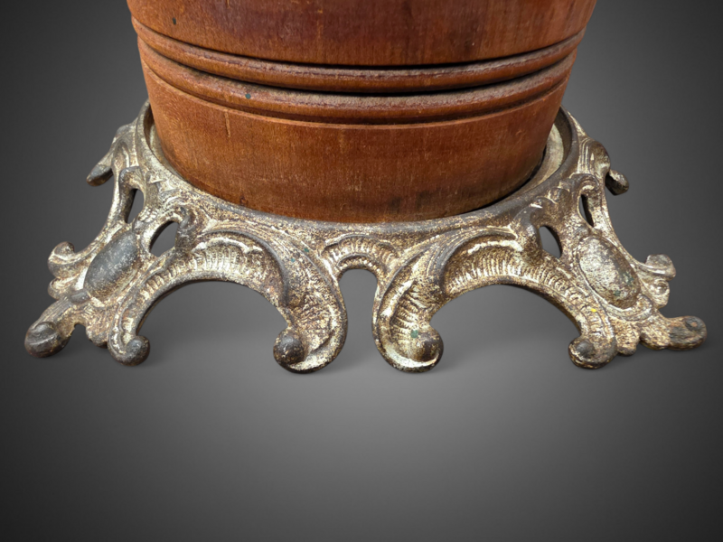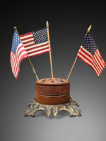 This is a fantastic late 19th c. wood and cast iron flag holder in original surface and paint. Features an ornate cast iron base with filigree and C scroll decoration. A maple wood lafhe turned flag holder is screw to its base and has turning decoration. Overall good co dition with an a great historical surface. A flew flags featured are included.