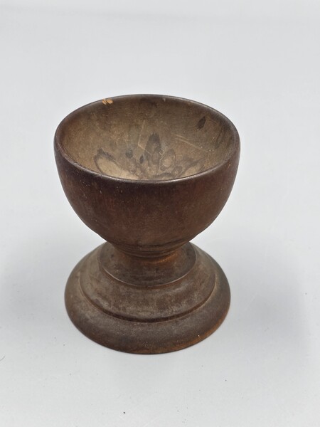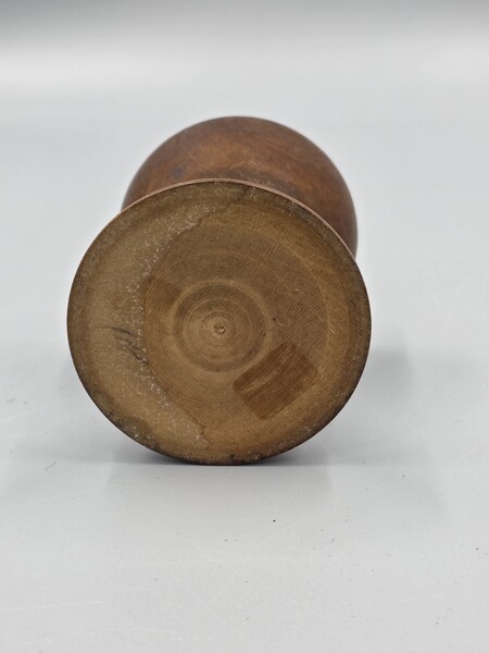 A 19th C. treen master salt comprised of a single body of lathe turned figured maple wood. A bulbous shaped bowl sits atop a step turned base. Retains a beautiful mellow patina. Excellent original condition. New England or Pennsylvania origin. Ca. 1830. 2 1/2"T.