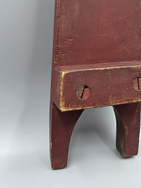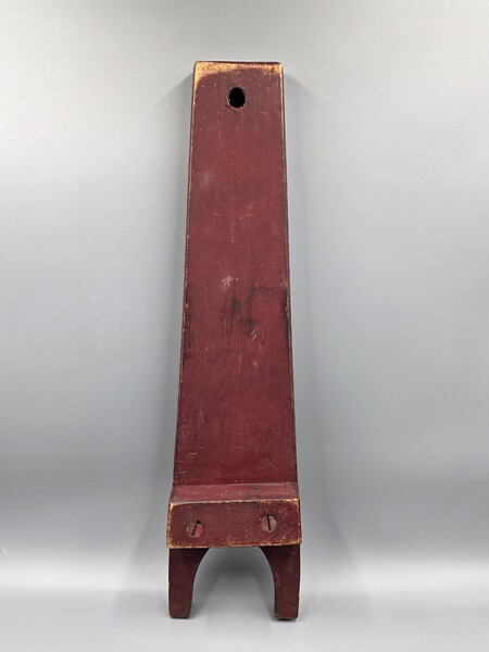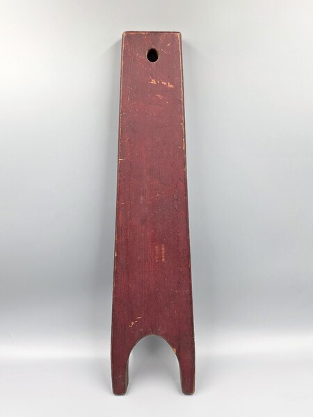 This is a great 19thC boot jack in old red paint found in New England. It is made of maple with 2 old iron screws. It's 20 inches in length.