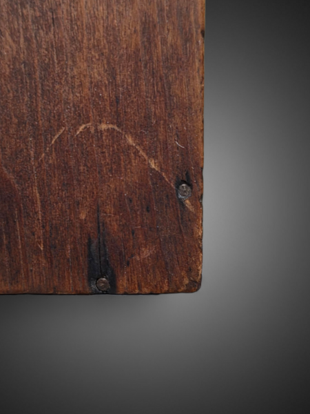 Wonderful 18thC Queen Ann wall box. The backboard is made of thick stock maple and the front and sides are made of pine. Old glued crack to front which does not distract. It is 7 3/4" W x 9 1/2"H x 3"D with great rosehead nails and retains an original brown stain.