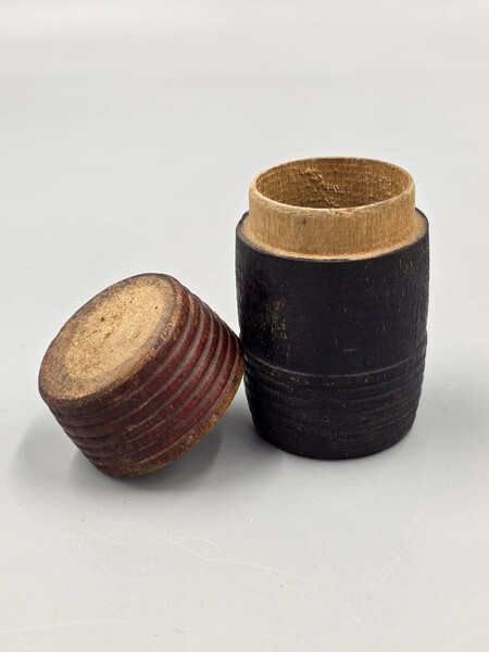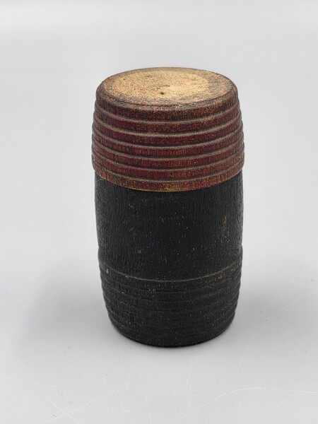A wooden needle case in original black paint with a red cover. Made of lathe turned maple wood. Excellent condition! Ca. 1910.