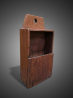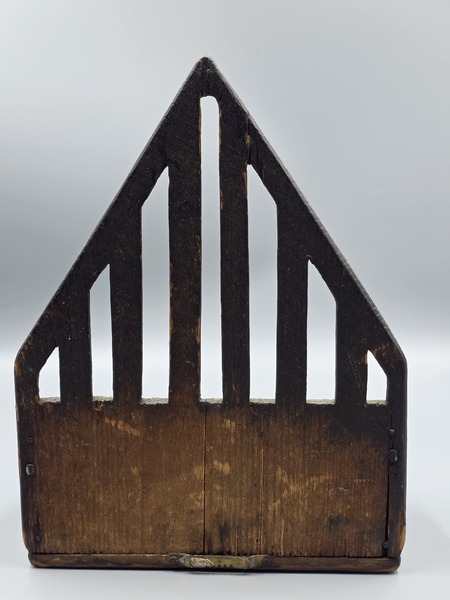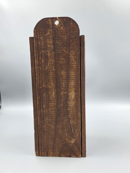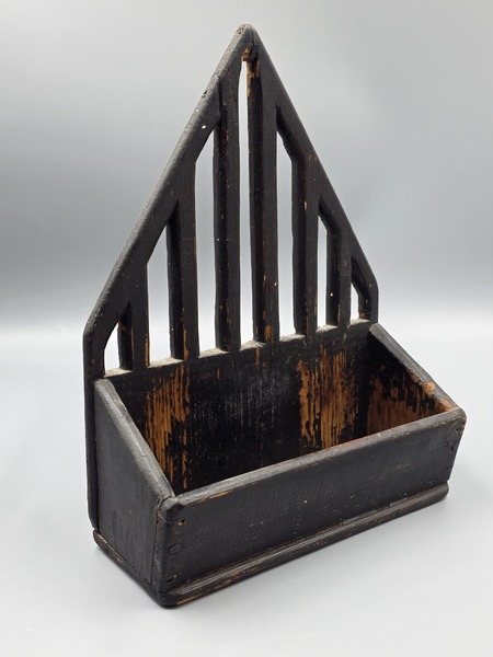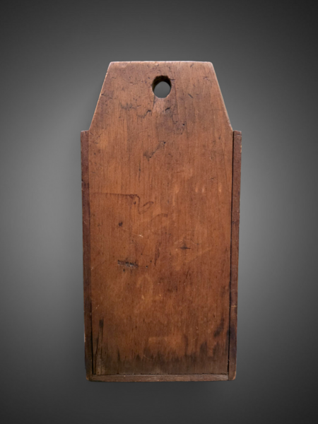 An early Wall box with a very unusual cutout on the backboard. Made of pine wood and has great early square nails. Retains excellent old black paint. New England. Ca. 1840. 10 1/2"T x 8"W.