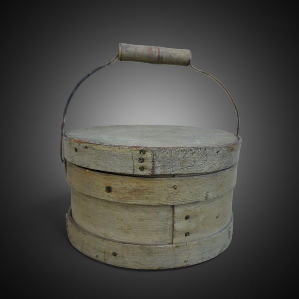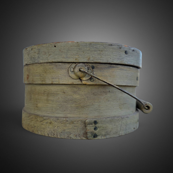 Here is a wonderful 19th c bail handled pantry box in original sage colored paint. Made of pine with early iron nails joining the lap joints. A wire bail handle with a lathe turned maple wood hand grip is attached on the sides with iron brackets. Excellent original condition and has great paint history! New England. Ca. 1850. Charming size at 8 3/4"W.