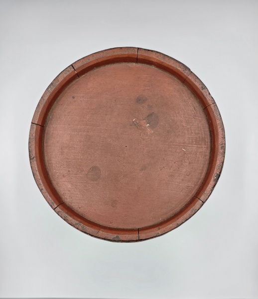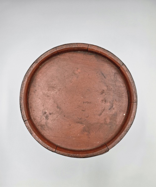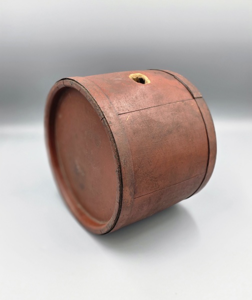 This is a fabulous 19th c. canteen in original red paint. Staved and banded with iron hoops and retains such good paint with craving from age. Survives in superb condition with quality color. 8 1/2"W x 6 1/2"T.