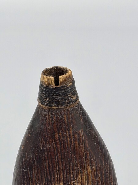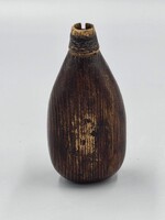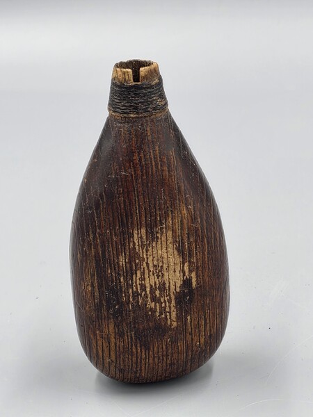 Here's a nice little wooden powder flask in old varnished finish. Made of pine in two pieces and glued together and reinforced with old black string on the neck. Good condition with very minor wear on the body and neck. These old powder flasks made this way are scarcely found. New England. Ca. 1830. 4 1/8"T.