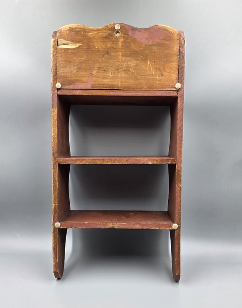 This little shelf is fantastic! Mase of pine with exceptional rose colored paint and old iron nails. Has nicely shaped sides. Very good condition with a few later nails reinforcing some age related cracks but soes not bother the appearance. Has great paint! Ca. 1890. 19 1/2"T x 10"W x 4 1/2"D