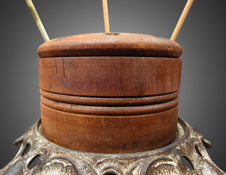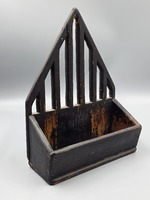 A wooden string holder in an unusual format...can hang on the wall via a pierced hole in its backboard or sits table top. The reverse features a neat painting of a basket of flowers in polychrome paints. Constructed with small iron nails. Excellent condition and a neat piece of treen! Ca. 1920. 5 11/16" T x 4"W x 4"D.