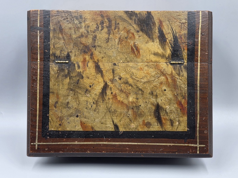 Nicely painted 19th c. dresser box in original brown paint with a marble faux painted cover. Made of pine wood and iron nails with brass hinges. Really good condition with good paint history! Ohio origin. Ca. 1890. 11"W x 8 3/4"D.