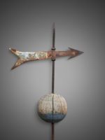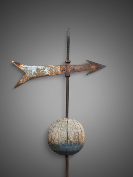 Here is an early 20th c or late 19th c. arrow weathervane in the best diminutive size. Iron post with a great wooden ball and iron and zinc arrow. The ball contains remnants of its original blue paint. Has a fantastic FANTASTIC surface from years of weathering. 19"T.