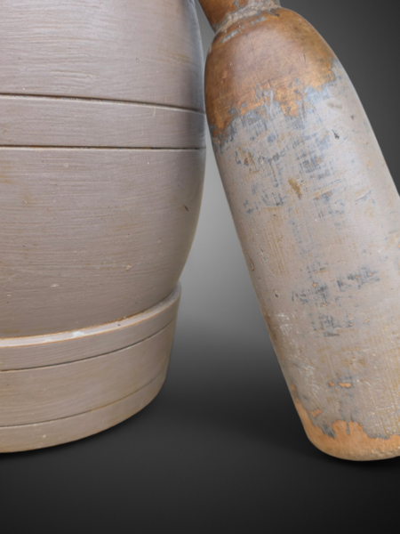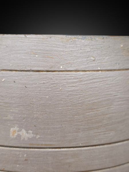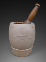 This is a very nice mortar and pestle in an uncommon mushroom colored paint over a grey primer. Made of lathe turned maple wood with its MATCHING pestle. Good condition with one tight old fissure to the mortar. Retains great paint surface with quality color. Ca. 1830. 12"T as shown.