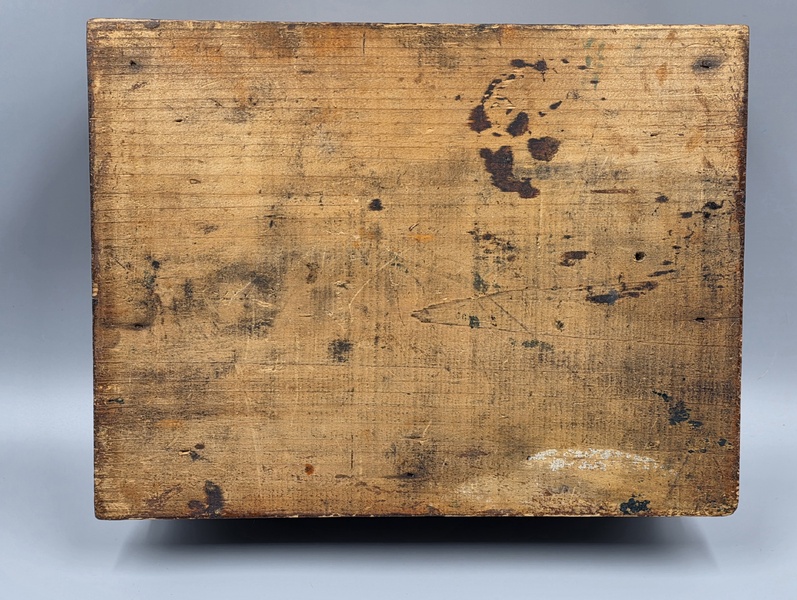 This is an early 19th c. pantty box in original unfinished surface. Constructed of ash and pine wood with early copper hand forged tacks reinforcing the wonderful fingers on the lap joints. Survives in very good original condition with two neat mouse chews and a tiny loss on the bottom of the body in front. New England. Ca. 1820. 10 7/8"W.