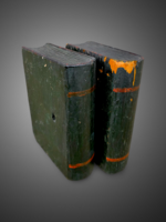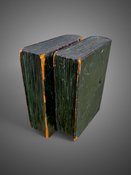 Here is a neat pair of 19th c. faux wooden books in original windsor green paint with red highlights. Carved from the solid by hand and features carved channels for pages. Both retain great old paint with some wear. Possibly used as bookends. 7 1/2"T. 5 1/2"D x 2"W.