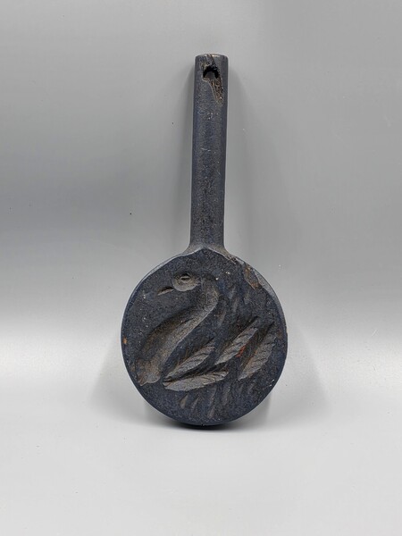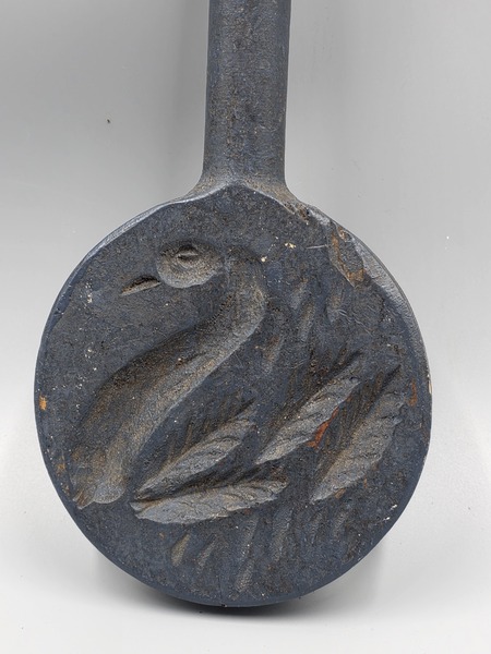Here's a nice butter print in old dark blue paint. Made of pine and has carving of a swan on the butter side. Scarcely found. Ca. 1890. 7 7/8"T.