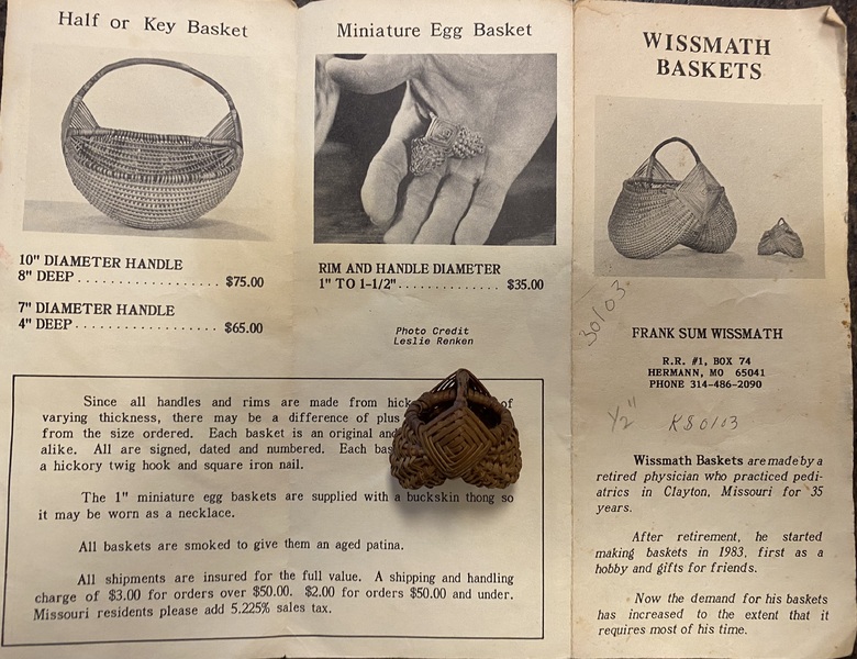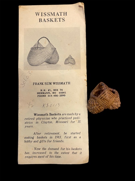 Carved dog holding a peach pit basket 5 1/2" x 5" tall. Ex Carol Wahler Collection This peach pit basket is probably not original to the carving.