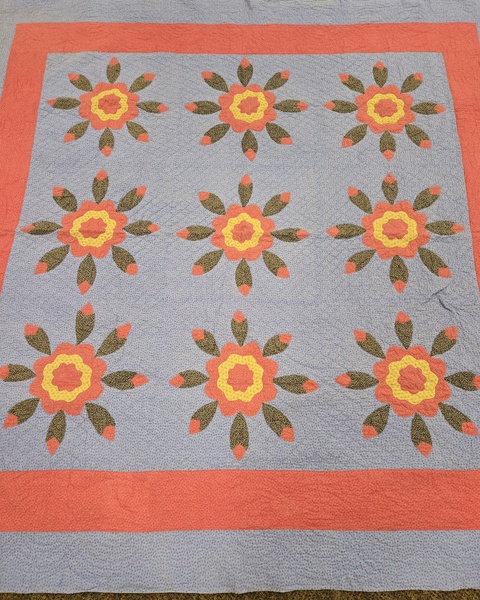 A fine cotton quilt in the typical color palette of southeastern Penna in tones of pink, yellow against a sky blue field. This quilt dates from the 1930-40's and is in excellent condition. Measurements: 76 inches square.