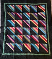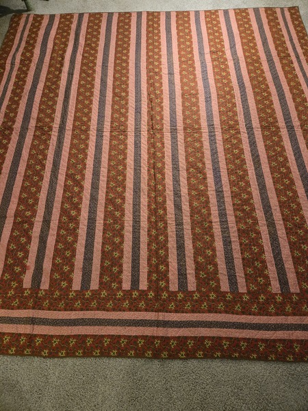 Bold colors make this Bar Quilt pop! Tones of pink, red and purple define the color palette and although they clash, these colors are dynamite! Size is generous and would fit a Queen bed