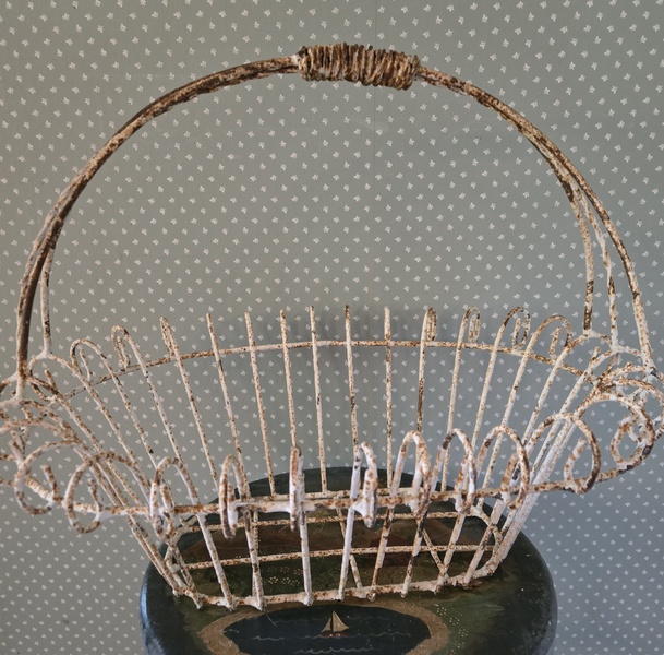 Rustic iron wire garden basket with weathered surface of white paint over metal. Size is 19 x13 x 15 high. Perfect for Holiday greens and pinecones.