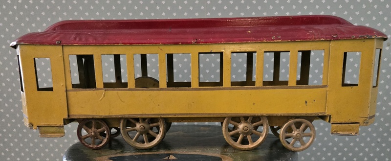 Dating to 1910, this antique Dayton Schieble Pressed Steel Hill Climber Trolley is a vintage piece that will capture the wonder of the golden era of toy making. This model shows appropriate wear although the paint is in excellent condition with a minimum of rust. The working parts are missing. All wheels are present. This makes a great wall piece when hung on the wall for color and fun!