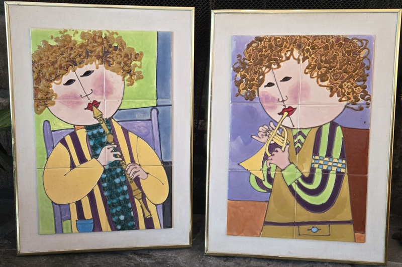Harris Strong (1920-2006) was known as a ceramic tile maker and worked in Ellsworth, Maine to create images using tiles measuring 4 x 4. Most of his work has an Art Deco feel with a touch of Pop culture. This is a pair of musicians--each panel has 6 tiles forming an image of a musician--one is a trumpet player and the other is playing a recorder. They tiles are mounted and framed with no glass frontage. Each musician framed measures 16 x 23. The tiles are frame with a gold metallic frame and wired for the wall. All the mountings are secure and there are no chips, cracks, etc. These are being sold only as a pair. Shipping will be $55 due to the weight of the ceramic tiles. Don't let that hinder your choice! This pair makes a strong design statement!