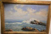 Pleasing seascape on Board by Evelyn Ivy, listed Massachusetts artist. The painting is of Maine seashore. Ivy is a listed artist in Who's Who and worked in the Boston, MA area. Size: 8 x 10 in original frame.