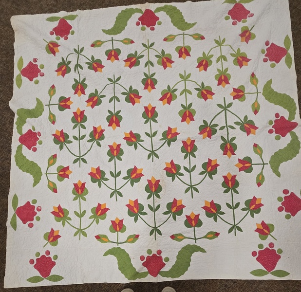 Found in Penna, this quilt features a floral vase design. Perfect for a twin bed, the quilt measures 64" x 78". Age: 1930-1940 There is an early repair in the center of the quilt that is so well done one does not notice the repair. Clean, freshly laundered, and no stains. All cotton.