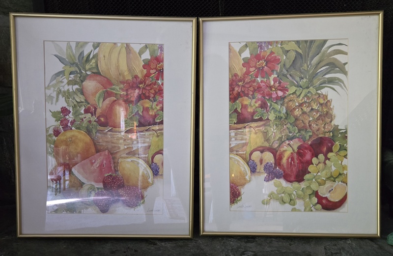 Pair of Fruit and Vegetable watercolors by Linda Lucas, teacher and artist working in Chautauqua, NY and in Braden, Florida. She is well known for her flora, botanical and tropical scenic paintings. A graduate of the Rochester Institute of Technology with a degree in Fine Art, Linda's work can be found in galleries in Orchard Park and Bemus Point, NY. Linda also conducts watercolor classes at the Chautauqua Institute. This pair is well framed in anodized gold metal frames. Finished size is 16 inches by 18 inches. Age: 1980-90. Sold only as a pair.