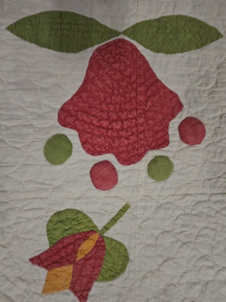 This quilt dates from the second or third quarter of the 19th century. The red cherries are highlighted with Trapunto work. The border is strong and serves to frame the design. In some places, there is wear and the fabric has flattened but the overall pattern is delightful. There is evidence of wear on the binding, but the clarity of design makes this quilt worthwhile. Size 78" Square. Found in western New York State. Freshly laundered.