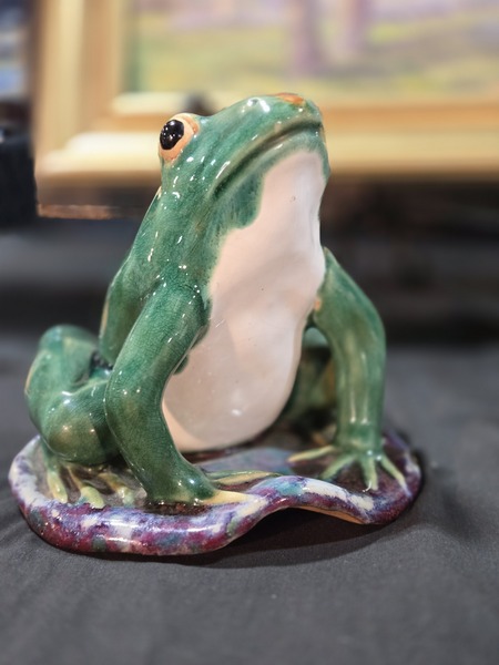 Every garden and every book shelf needs a friendly frog! This example in high glaze offers color and form to please everyone. Size: about 6" tall. No artist identification.